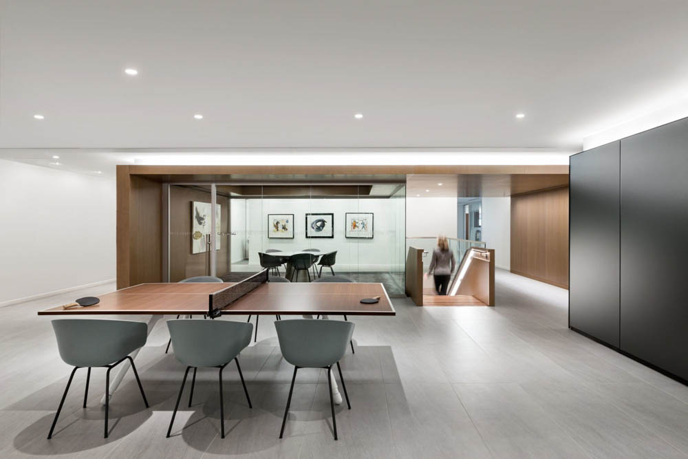 十字形建筑平面的交叉点自然形成了一个活力中心枢纽。这里设有非正式会议室、休息区、图书室、咖啡吧、还有一张乒乓球桌,旨在打造成一个开放休闲的员工社交中心。