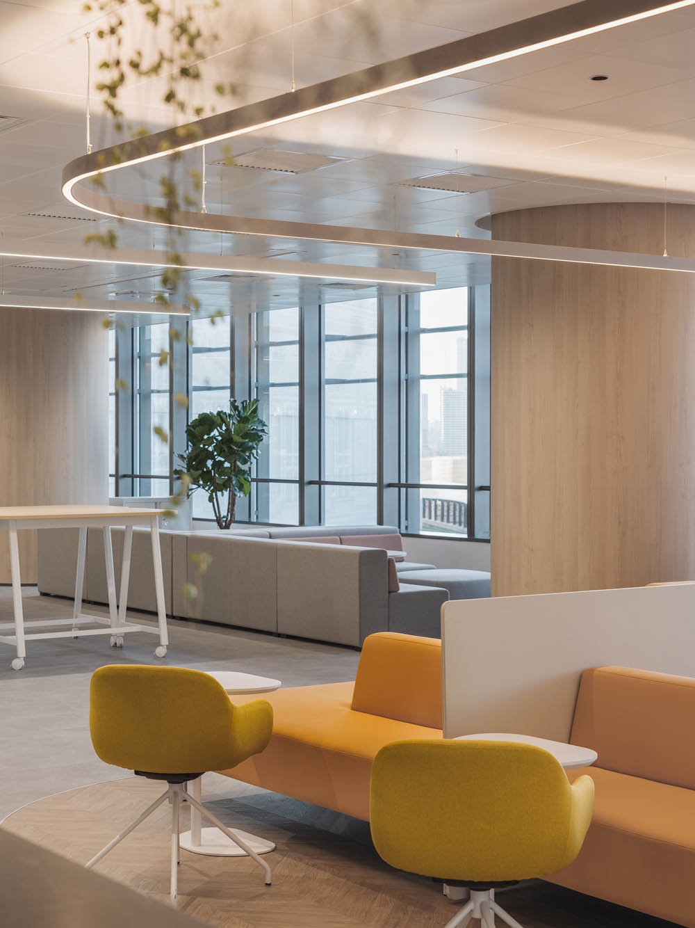 开放办公区色彩淡雅、布局简约,人体工学椅和升降办公桌呵护着员工的身体健康;会议室形式多样、功能多元,专业的光环境展现了功能性与艺术性的统一。
