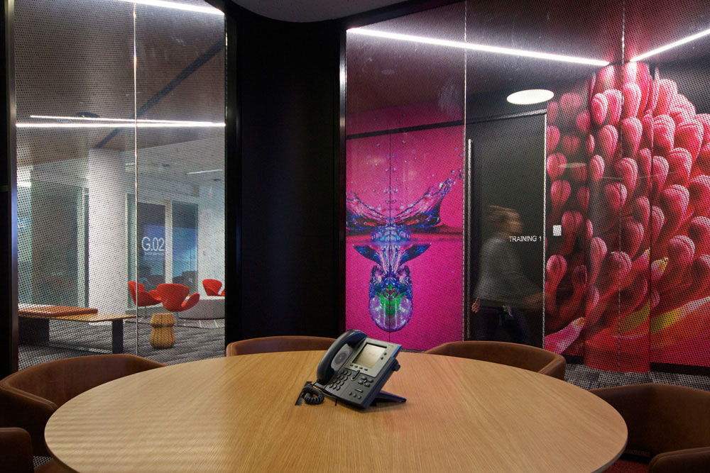 本案的公共空间规模宏大用色鲜明。配色方案以强烈的明暗对比来烘托环境,选用企业精美的作品大幅面的装饰于墙体上,由此带来强烈的视觉冲击。