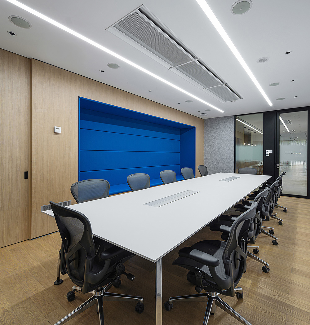 每个会议室和独立办公室,为了控制隔音及混响时间,系统玻隔断全采用双层玻璃,在空间内墙饰面材料上选用了有吸音功能的软包布料及吸音棉材料。
