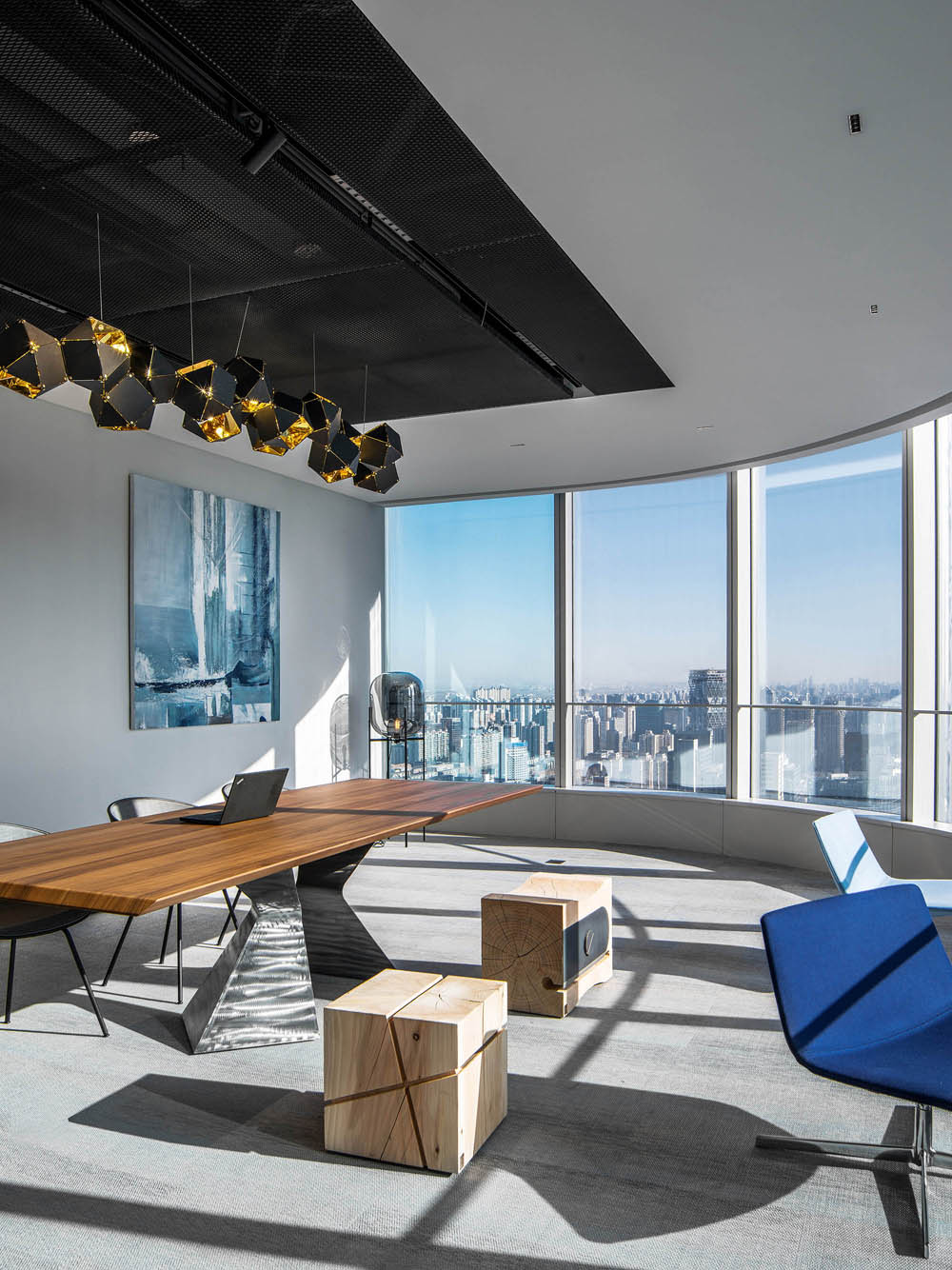 会议区以优雅的灰色为基调,混合橙色、红色、蓝色,跳动的色彩搭配平衡办公氛围的严肃、沉静。休闲区被设置在视野最开阔的区域,近270度的环绕落地窗装裱户外的天光云影,成为空间的巨幕。流线型,艺术感观性高的高品质办公家具丰富空间层次变化,使空间更为灵动,打破办公环境的枯燥和乏味。