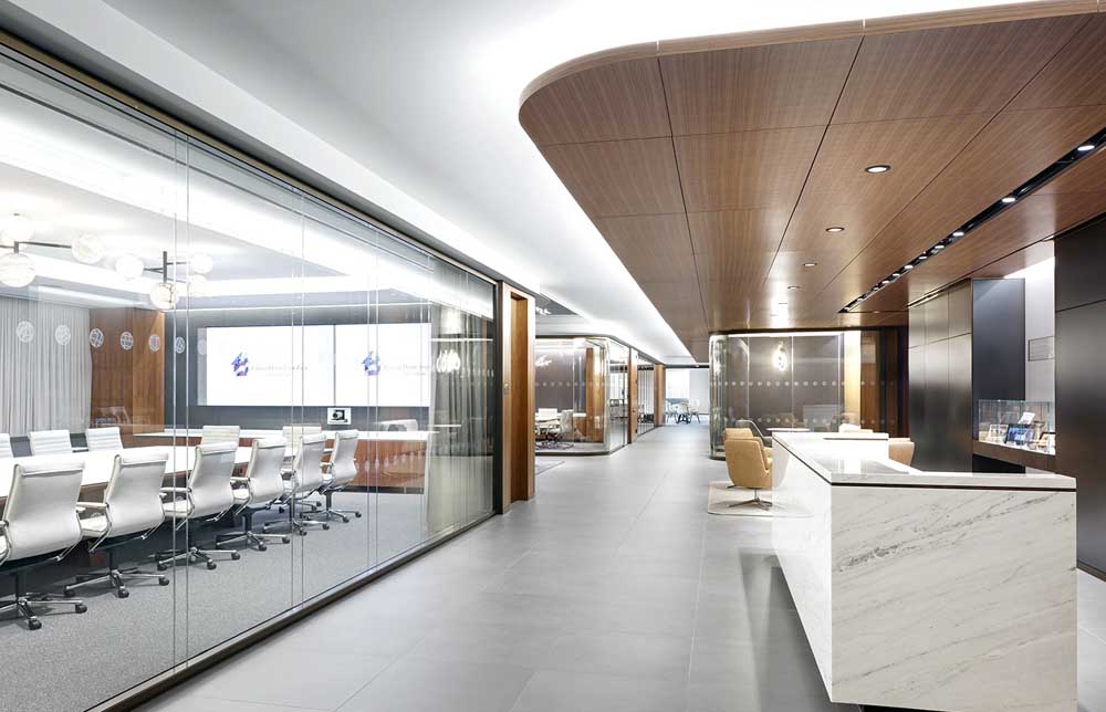 把吊顶的四个角落都做成圆弧造型的设计,这样可以让平直的天花有着更加圆滑优雅的线条感,搭配上优雅舒适的办公家具布置,可以让空间显得更加温馨、浪漫而高级大气。这样既可以增加天花的层次感,又能通过木质感营造中式风格的氛围效果。
