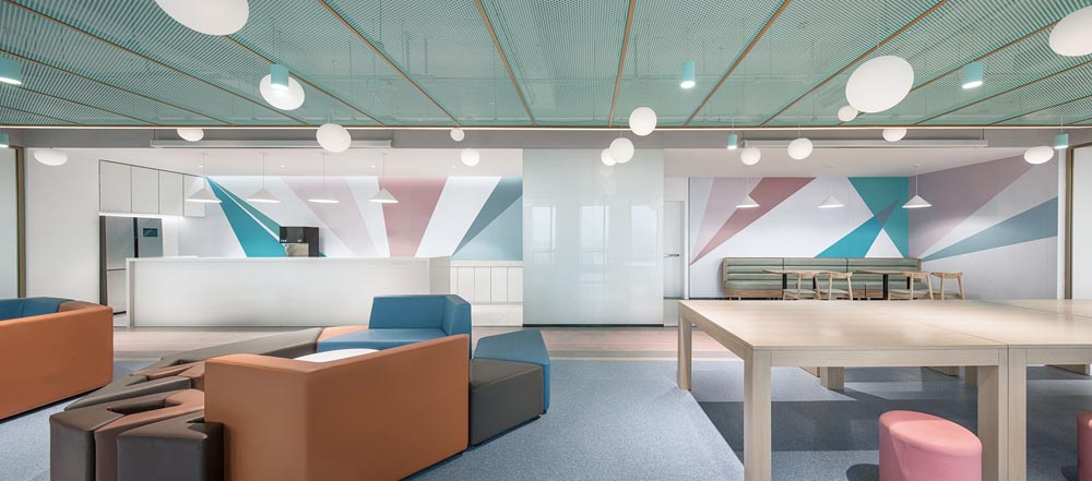 大厅入口处是一个定制会议室,如同富有视觉感的彩色盒子,由柔软梦幻的蓝色长城板和透明玻璃制成,营造出通透包容的氛围。